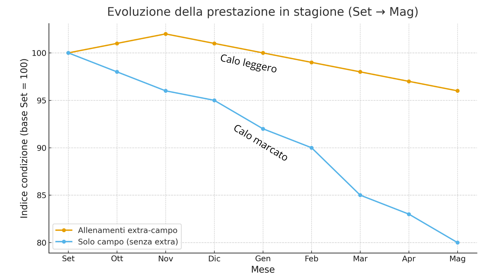Programma in-stagione con carichi dosati e progressivi per mantenere forza e resistenza, sviluppando velocità, potenza e reattività senza accumulare fatica.